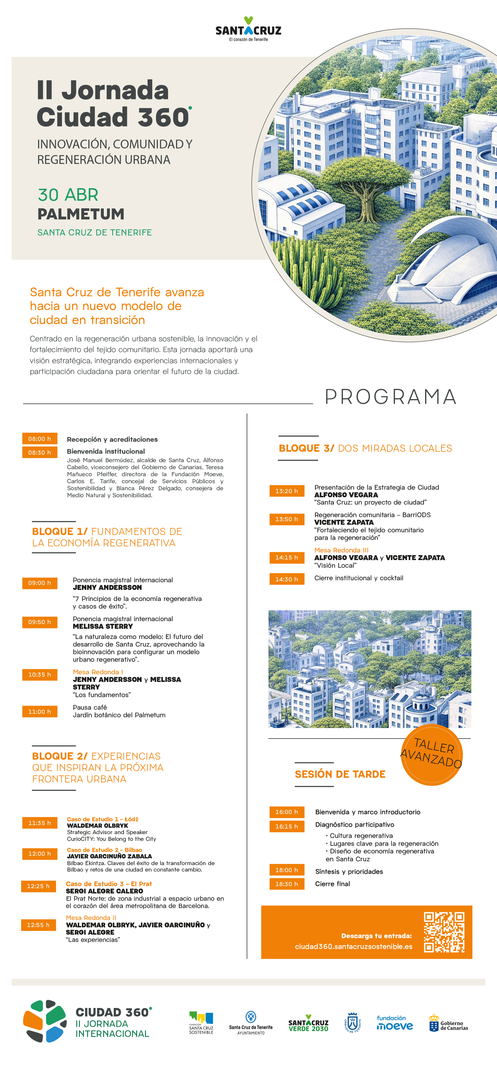 A través de este enfoque participativo, la II Jornada Internacional “Ciudad 360°” busca impulsar soluciones concretas y estrategias innovadoras que contribuyan a posicionar a Santa Cruz de Tenerife como un referente en regeneración urbana y desarrollo sostenible.